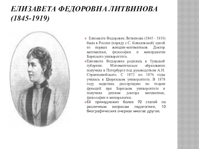 России (наряду с С. Ковалевской) одной из первых женщин-математиков. Доктор математики, философии и минералогии Бернского университета.