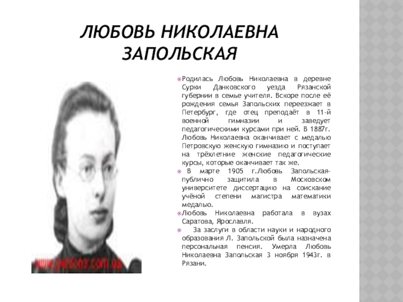 В марте 1905 г.Любовь Запольская- публично защитила в Московском университете диссертацию на соискание учёной степени магистра математики медалью.