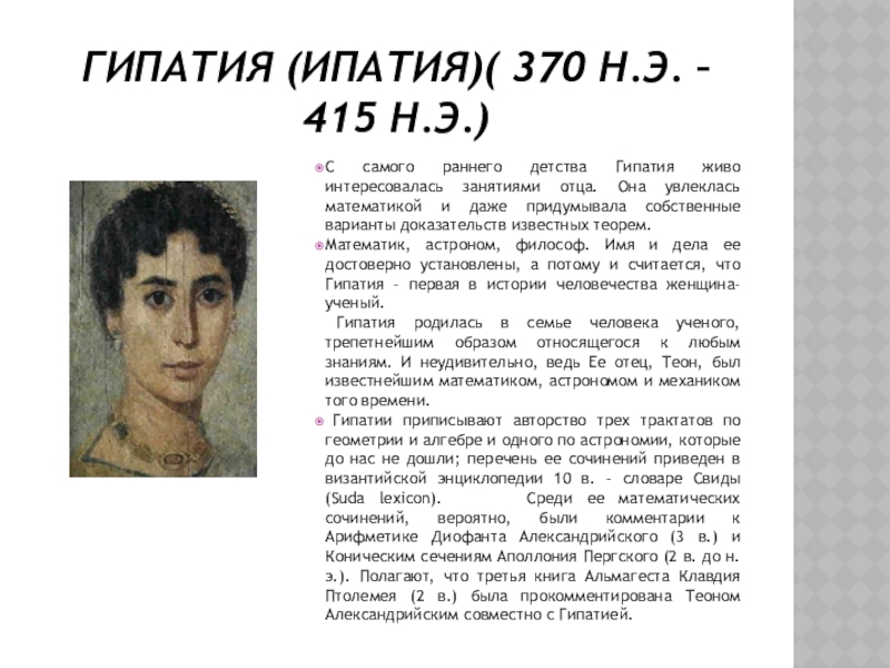 Слайд 4Гипатия (Ипатия)( 370 н.э. – 415 н.э.)