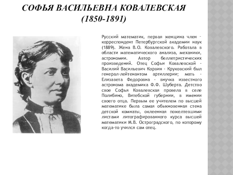 наук (1889). Жена В.О. Ковалевского. Работала в области математического анализа, механики, астрономии. Автор беллетристических произведений. Отец Софьи Ковалевской - Василий Васильевич Корвин - Круковский был генерал-лейтенантом артиллерии; мать - Елизавета Федоровна - внучка известного астронома академика Ф.Ф. Шуберта. Детство свое Софья Ковалевская провела в селе Полибино, Витебской губернии, в имении своего отца. Первым ее учителем по высшей математике была самая обыкновенная стена детской комнаты, оклеенная пожелтевшими листами литографированного курса высшей математики М.В. Остроградского, по которому когда-то учился сам отец.