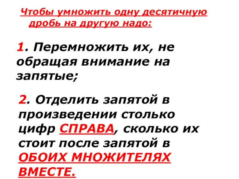 2. Отделить запятой в произведении столько цифр СПРАВА, сколько их стоит после запятой в ОБОИХ МНОЖИТЕЛЯХ ВМЕСТЕ.