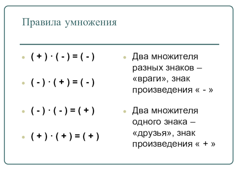 Два множителя разных знаков – «враги», знак произведения « - »