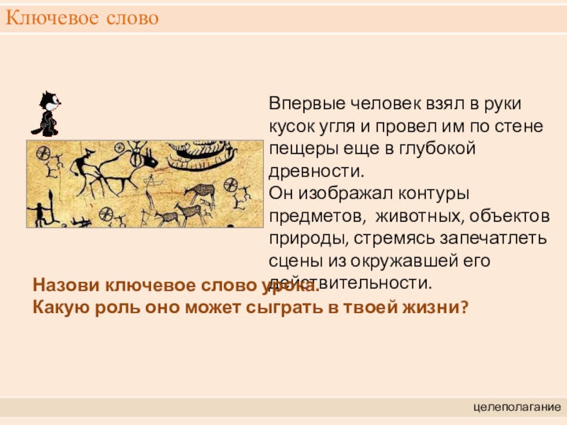 Ключевое словоцелеполаганиеВпервые человек взял в руки кусок угля и провел им по стене пещеры еще в глубокой