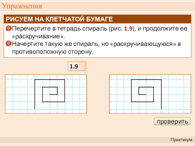 УпражненияПрактикум.Перечертите в тетрадь спираль (рис. 1.9), и продолжите ее «раскручивание». Начертите такую же спираль, но «раскручивающуюся» в