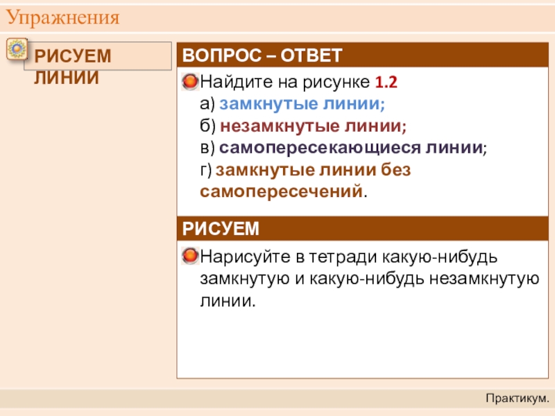 УпражненияПрактикум.Найдите на рисунке 1.2  а) замкнутые линии; б) незамкнутые линии; в) самопересекающиеся линии; г) замкнутые линии