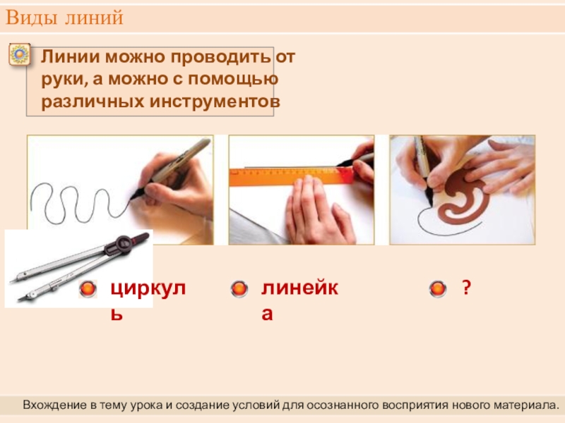 Виды линийВхождение в тему урока и создание условий для осознанного восприятия нового материала.линейкациркуль?