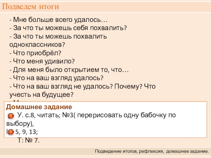 Подведем итогиПодведение итогов, рефлексия,  домашнее задание.- Мне больше всего удалось…- За что ты можешь себя похвалить?- За