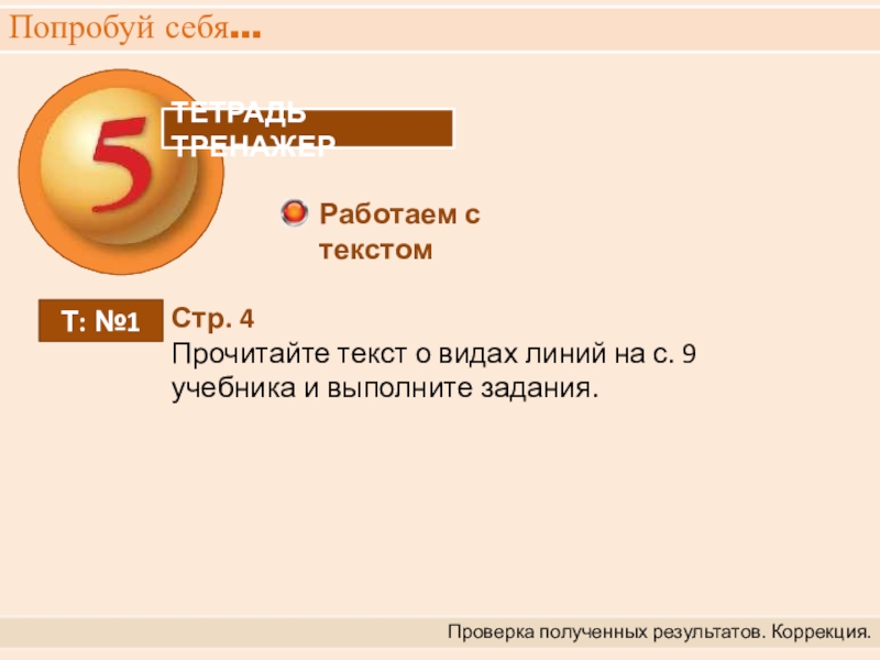Попробуй себя…Проверка полученных результатов. Коррекция.Работаем с текстомТ: №1Стр. 4 Прочитайте текст о видах линий на с. 9