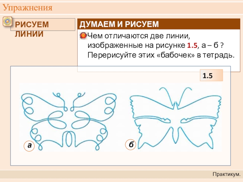УпражненияПрактикум.Чем отличаются две линии, изображенные на рисунке 1.5, а – б ? Перерисуйте этих «бабочек» в тетрадь.ДУМАЕМ