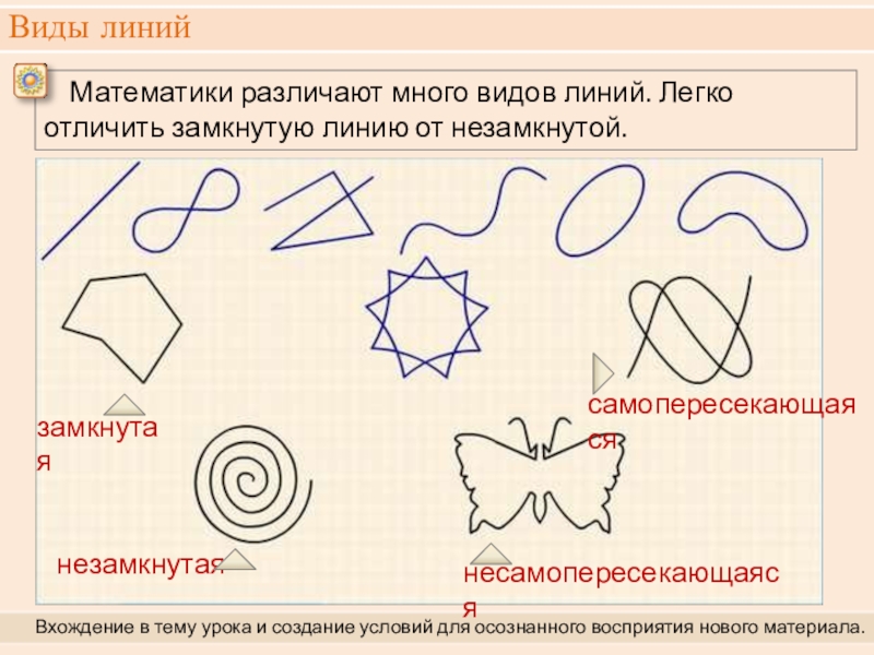Математики различают много видов линий. Легко отличить замкнутую линию от незамкнутой.Виды линийВхождение в тему урока