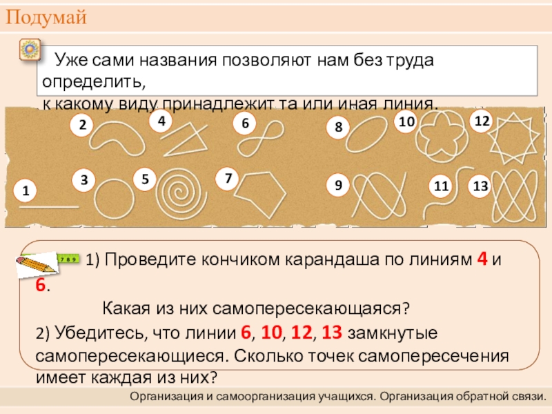 1) Проведите кончиком карандаша по линиям 4 и 6. Какая из них самопересекающаяся? 2) Убедитесь, что линии 6, 10, 12, 13 замкнутые самопересекающиеся. Сколько точек самопересечения имеет каждая из них?