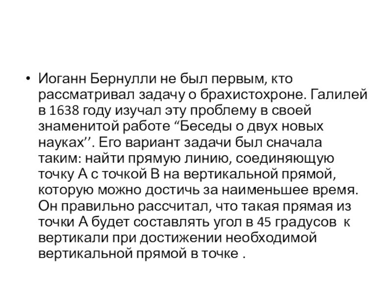 в 1638 году изучал эту проблему в своей знаменитой работе “Беседы о двух новых науках’’. Его вариант задачи был сначала таким: найти прямую линию, соединяющую точку А с точкой В на вертикальной прямой, которую можно достичь за наименьшее время. Он правильно рассчитал, что такая прямая из точки А будет составлять угол в 45 градусов к вертикали при достижении необходимой вертикальной прямой в точке .