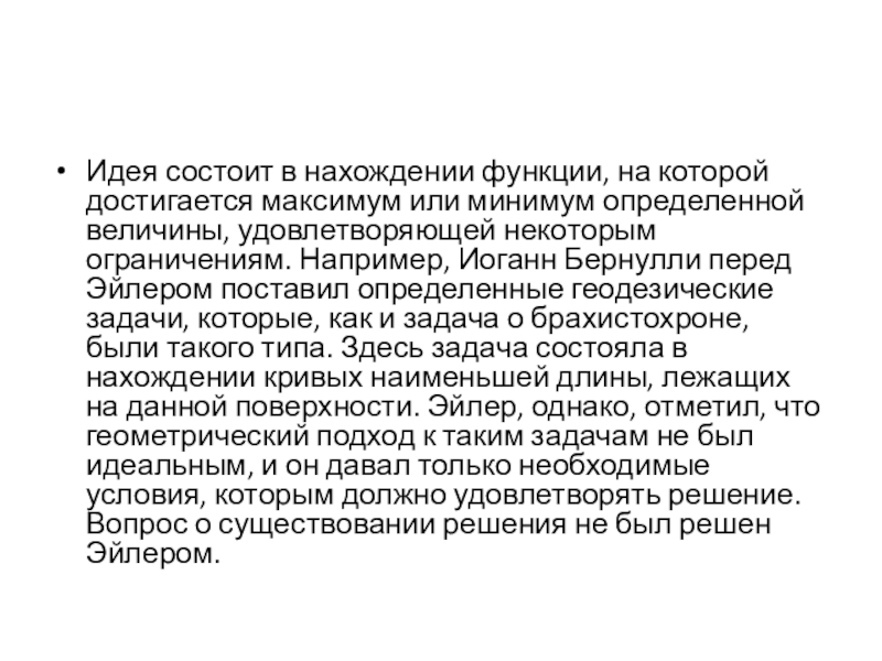 определенной величины, удовлетворяющей некоторым ограничениям. Например, Иоганн Бернулли перед Эйлером поставил определенные геодезические задачи, которые, как и задача о брахистохроне, были такого типа. Здесь задача состояла в нахождении кривых наименьшей длины, лежащих на данной поверхности. Эйлер, однако, отметил, что геометрический подход к таким задачам не был идеальным, и он давал только необходимые условия, которым должно удовлетворять решение. Вопрос о существовании решения не был решен Эйлером.