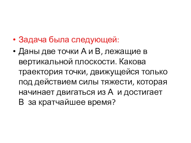 “Задача. Требуется найти кривую АDB , по которой вес, под действием своей тяжести наиболее быстро спустится из точки A в точку B .