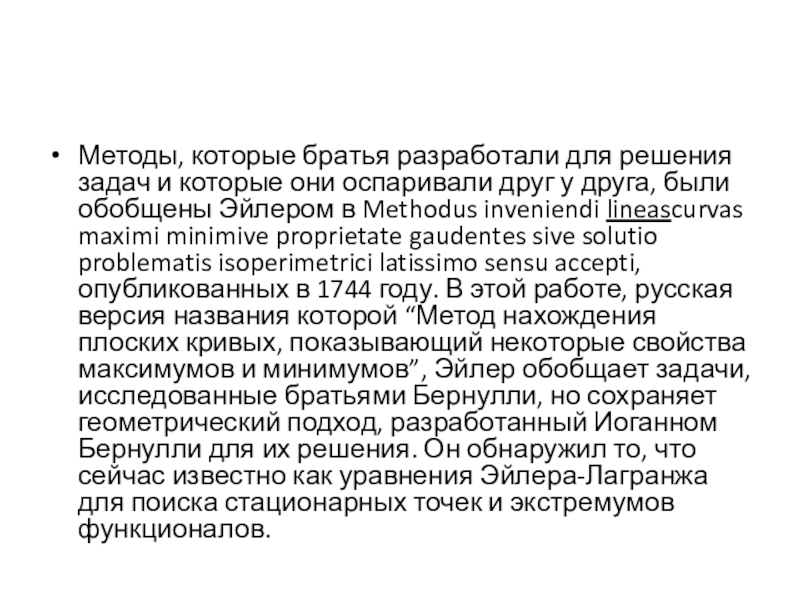 друг у друга, были обобщены Эйлером в Methodus inveniendi lineascurvas maximi minimive proprietate gaudentes sive solutio problematis isoperimetrici latissimo sensu accepti, опубликованных в 1744 году. В этой работе, русская версия названия которой “Метод нахождения плоских кривых, показывающий некоторые свойства максимумов и минимумов”, Эйлер обобщает задачи, исследованные братьями Бернулли, но сохраняет геометрический подход, разработанный Иоганном Бернулли для их решения. Он обнаружил то, что сейчас известно как уравнения Эйлера-Лагранжа для поиска стационарных точек и экстремумов функционалов.