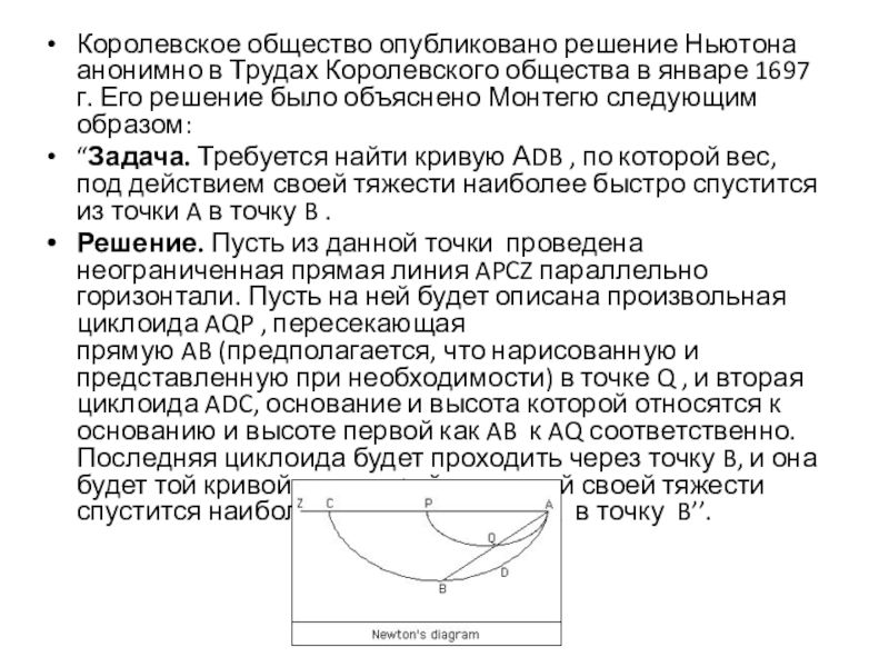 Слайд 7Королевское общество опубликовано решение Ньютона анонимно в Трудах Королевского общества в