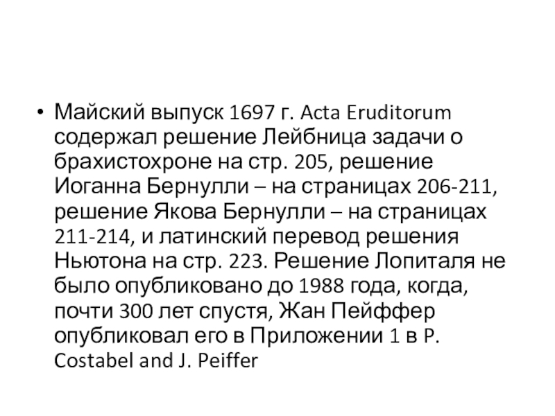 брахистохроне на стр. 205, решение Иоганна Бернулли – на страницах 206-211, решение Якова Бернулли – на страницах 211-214, и латинский перевод решения Ньютона на стр. 223. Решение Лопиталя не было опубликовано до 1988 года, когда, почти 300 лет спустя, Жан Пейффер опубликовал его в Приложении 1 в P. Costabel and J. Peiffer