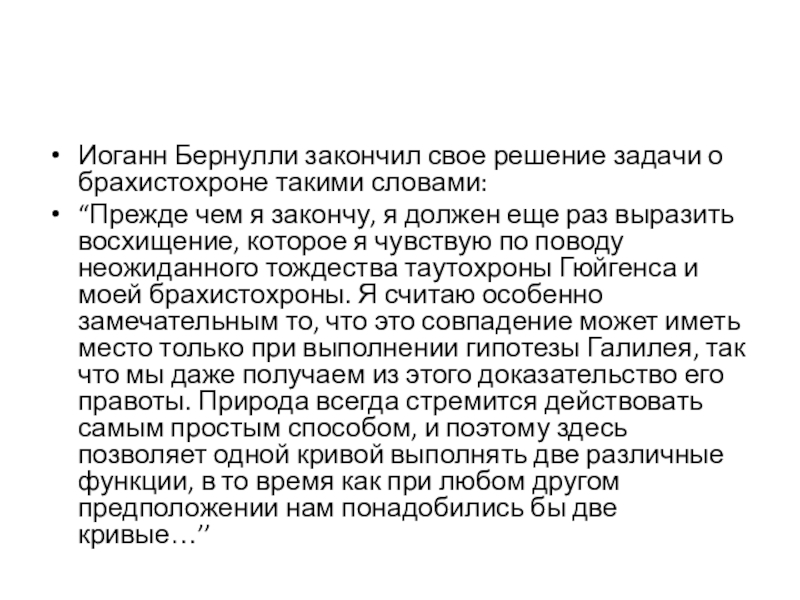 я закончу, я должен еще раз выразить восхищение, которое я чувствую по поводу неожиданного тождества таутохроны Гюйгенса и моей брахистохроны. Я считаю особенно замечательным то, что это совпадение может иметь место только при выполнении гипотезы Галилея, так что мы даже получаем из этого доказательство его правоты. Природа всегда стремится действовать самым простым способом, и поэтому здесь позволяет одной кривой выполнять две различные функции, в то время как при любом другом предположении нам понадобились бы две кривые…’’