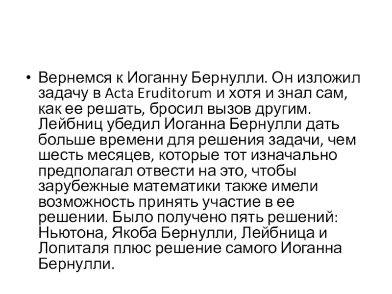 Слайд 6Вернемся к Иоганну Бернулли. Он изложил задачу в Acta Eruditorum и