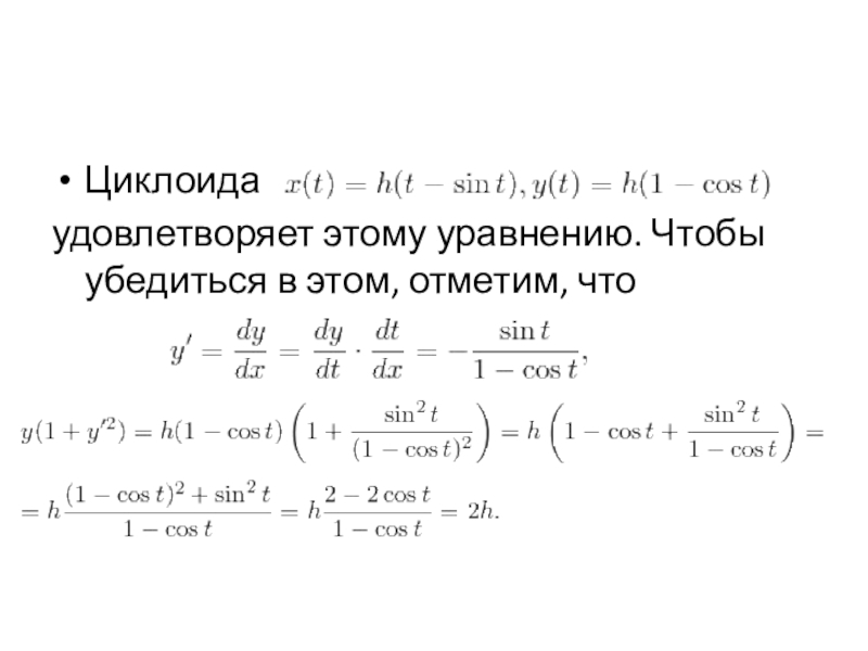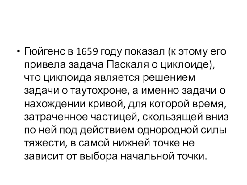 о циклоиде), что циклоида является решением задачи о таутохроне, а именно задачи о нахождении кривой, для которой время, затраченное частицей, скользящей вниз по ней под действием однородной силы тяжести, в самой нижней точке не зависит от выбора начальной точки.