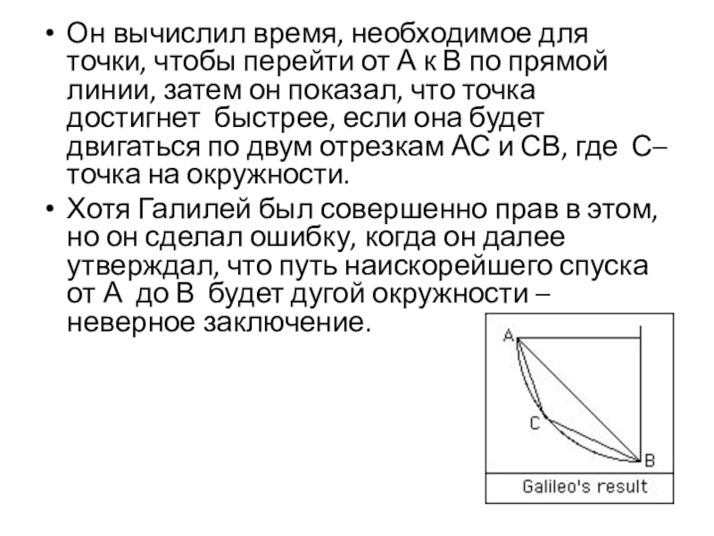 Хотя Галилей был совершенно прав в этом, но он сделал ошибку, когда он далее утверждал, что путь наискорейшего спуска от А до В будет дугой окружности – неверное заключение.