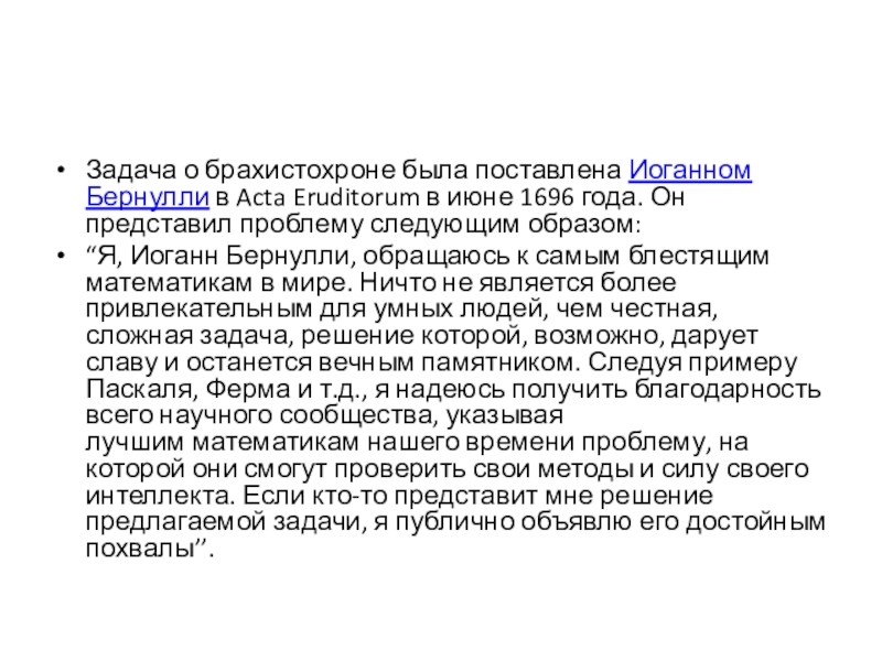 “Я, Иоганн Бернулли, обращаюсь к самым блестящим математикам в мире. Ничто не является более привлекательным для умных людей, чем честная, сложная задача, решение которой, возможно, дарует славу и останется вечным памятником. Следуя примеру Паскаля, Ферма и т.д., я надеюсь получить благодарность всего научного сообщества, указывая лучшим математикам нашего времени проблему, на которой они смогут проверить свои методы и силу своего интеллекта. Если кто-то представит мне решение предлагаемой задачи, я публично объявлю его достойным похвалы’’.
