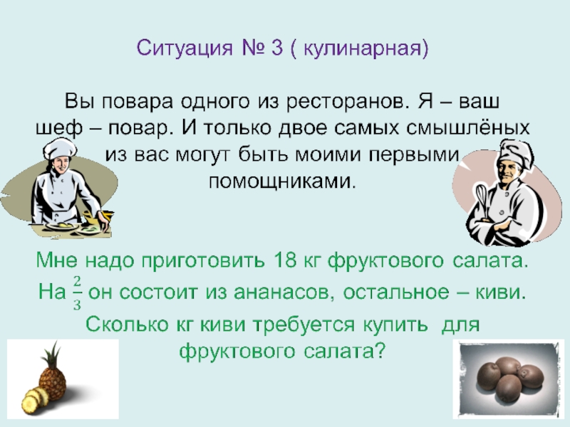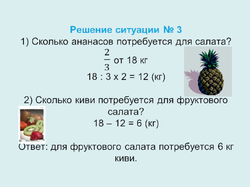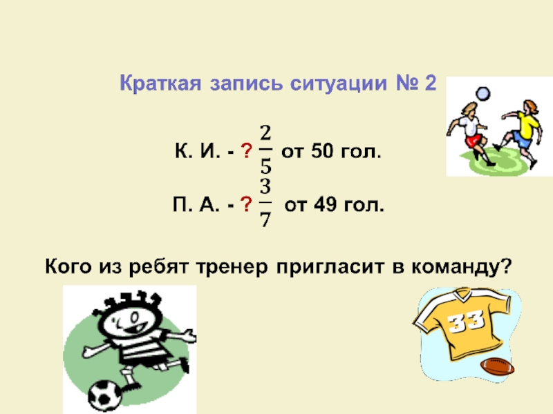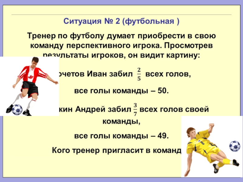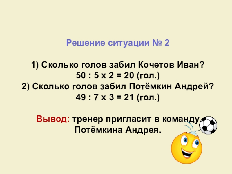 Решение ситуации № 2 1) Сколько голов забил Кочетов Иван? 50 : 5 x 2 = 20 (гол.) 2) Сколько голов забил Потёмкин Андрей? 49 : 7 x 3 = 21 (гол.) Вывод: тренер