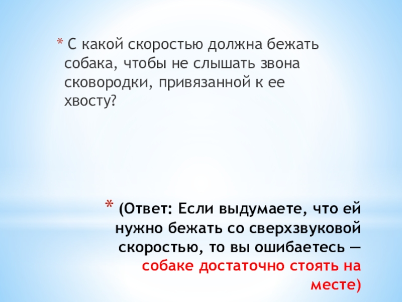 С какой скоростью должна бежать собака, чтобы не слышать звона сковородки, привязанной к ее хвосту?
