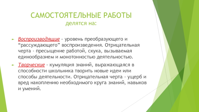 Воспроизводящие - уровень преобразующего и “рассуждающего” воспроизведения. Отрицательная черта