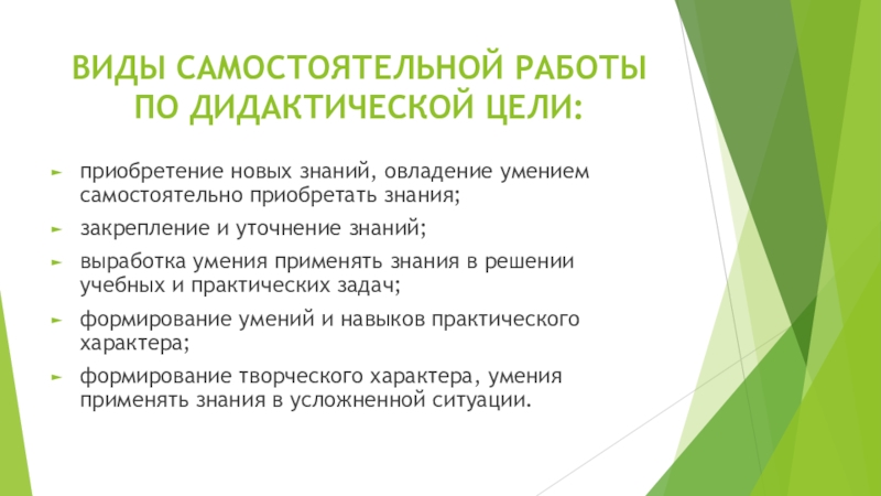 Слайд 5ВИДЫ САМОСТОЯТЕЛЬНОЙ РАБОТЫ ПО ДИДАКТИЧЕСКОЙ ЦЕЛИ:
