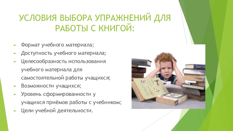 Слайд 9УСЛОВИЯ ВЫБОРА УПРАЖНЕНИЙ ДЛЯ РАБОТЫ С КНИГОЙ: