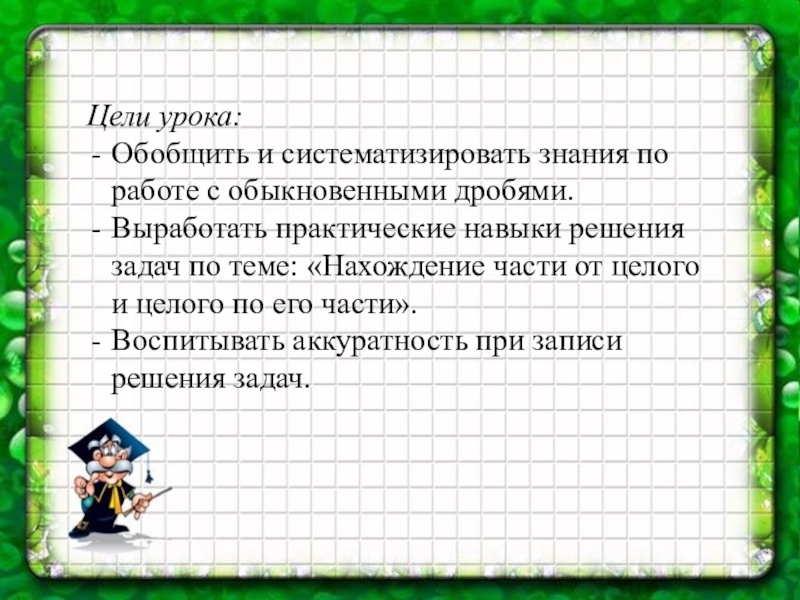 Цели урока:Обобщить и систематизировать знания по работе с обыкновенными дробями.Выработать практические навыки решения задач по теме: «Нахождение