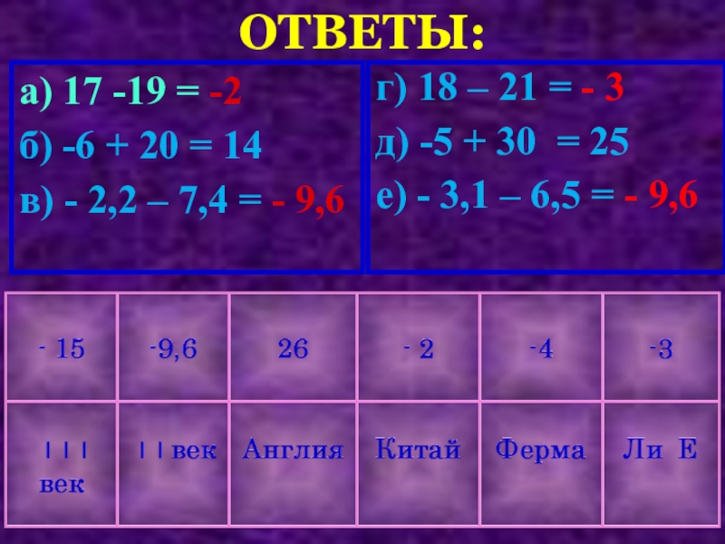 е) - 3,1 – 6,5 = - 9,6