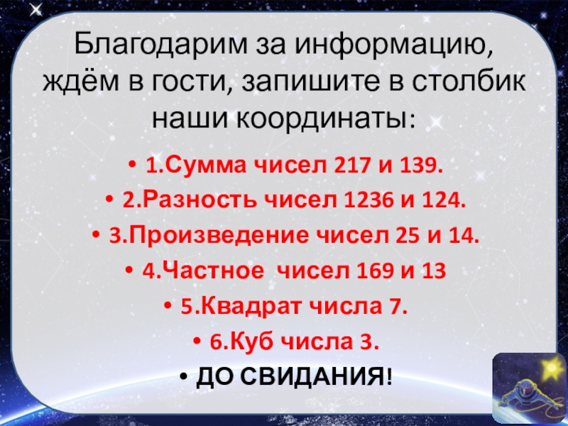 Благодарим за информацию, ждём в гости, запишите в столбик наши координаты:1.Сумма чисел 217 и 139.2.Разность чисел 1236