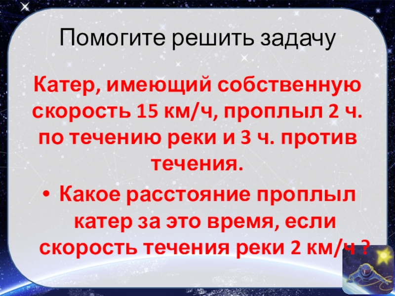 Катер, имеющий собственную скорость 15 км/ч, проплыл 2 ч.