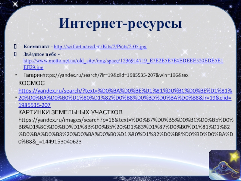 Интернет-ресурсыКосмонавт - http://scifiart.narod.ru/Kits/2/Picts/2-05.jpgЗвёздное небо - http://www.motto.net.ua/old_site//img/space/1296914719_E7E2E5E7E4EDEEE520EDE5E1EE29.jpgГагаринhttps://yandex.ru/search/?lr=19&clid=1985535-207&win=196&textКОСМОС https://yandex.ru/search/?text=%D0%BA%D0%BE%D1%81%D0%BC%D0%BE%D1%81%20%D0%BA%D0%B0%D1%80%D1%82%D0%B8%D0%BD%D0%BA%D0%B8&lr=19&clid=1985535-207КАРТИНКИ ЗЕМЕЛЬНЫХ УЧАСТКОВ https://yandex.ru/images/search?p=16&text=%D0%B7%D0%B5%D0%BC%D0%B5%D0%BB%D1%8C%D0%BD%D1%8B%D0%B5%20%D1%83%D1%87%D0%B0%D1%81%D1%82%D0%BA%D0%B8%20%D0%BA%D0%B0%D1%80%D1%82%D0%B8%D0%BD%D0%BA%D0%B8&_=1449153040623