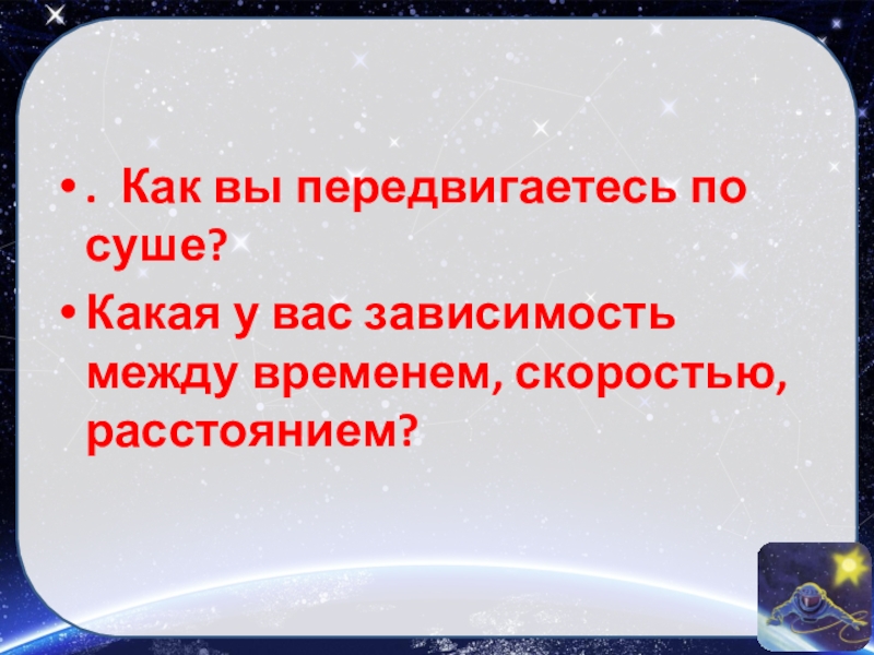. Как вы передвигаетесь по суше? Какая у вас зависимость между временем, скоростью, расстоянием?