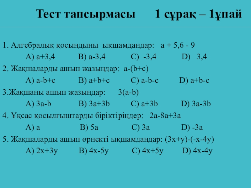 1. Алгебралық қосындыны ықшамдаңдар: а + 5,6 - 9