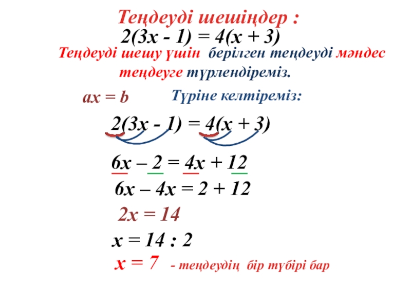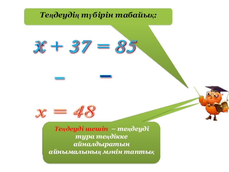 Теңдеуді шешіп – теңдеуді тура теңдікке айналдыратын айнымалының мәнін таптық
