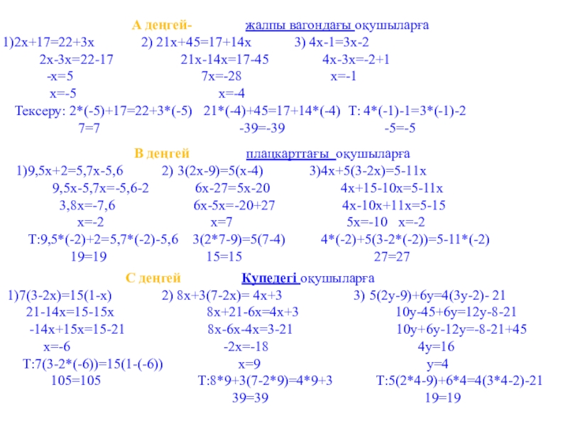 Т:9,5*(-2)+2=5,7*(-2)-5,6 3(2*7-9)=5(7-4) 4*(-2)+5(3-2*(-2))=5-11*(-2)