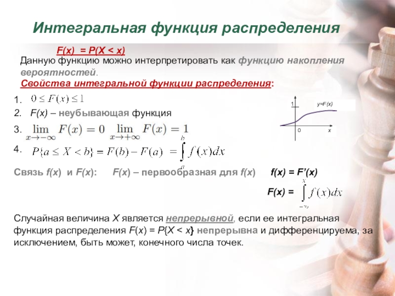 Случайная величина Х является непрерывной, если ее интегральная функция распределения F(x) = P{X < x} непрерывна и дифференцируема, за исключением, быть может, конечного числа точек.