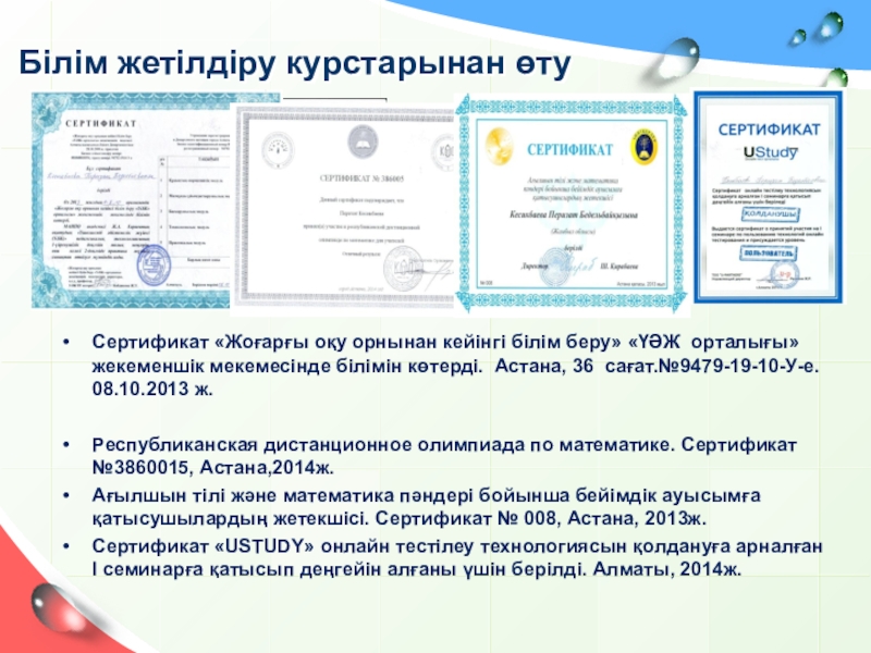 Анарбек Бақтыбек, математика пәні бойынша «Интелект» бейімдік ауысымына қатысушы. Сертификат. Астана, 2013