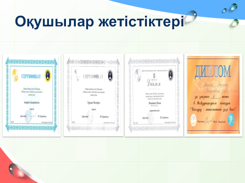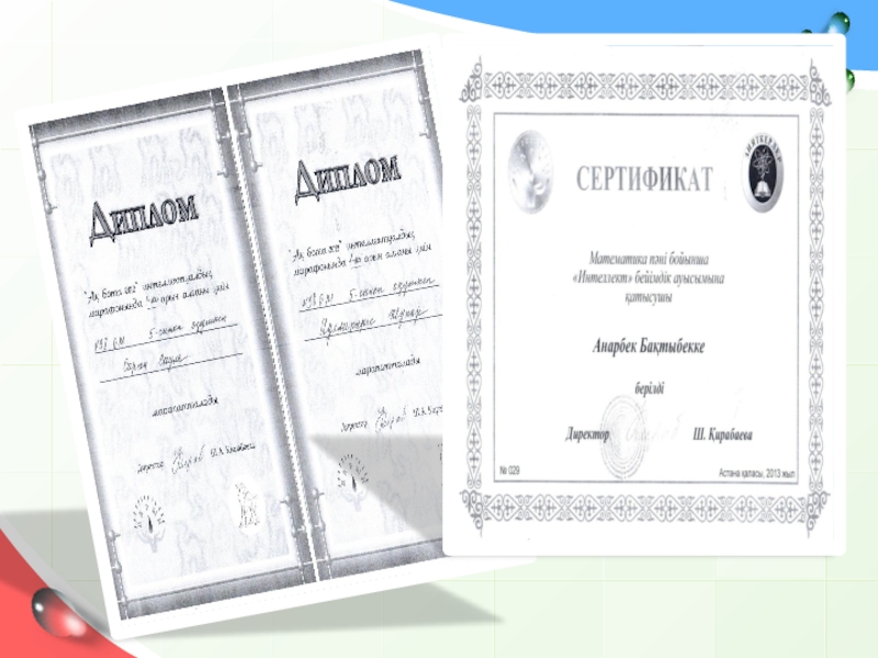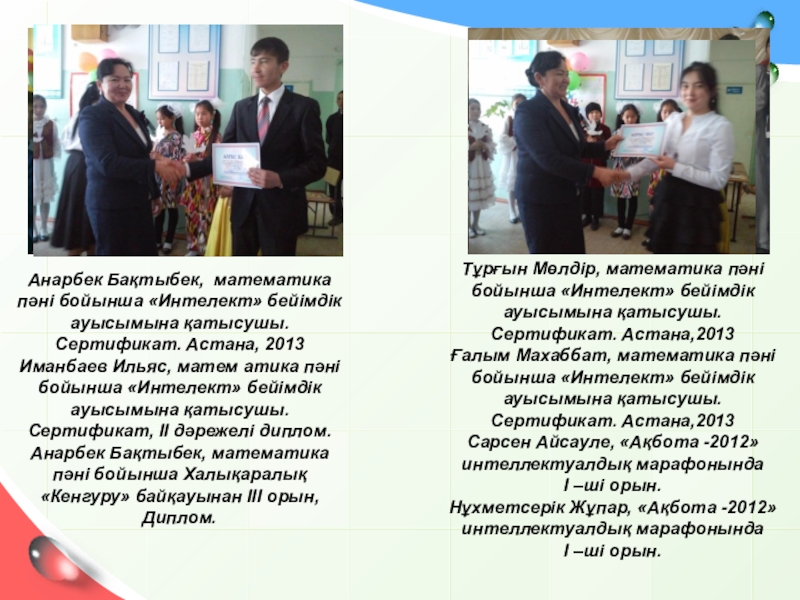 Иманбаев Ильяс, матем атика пәні бойынша «Интелект» бейімдік ауысымына қатысушы. Сертификат, ІІ дәрежелі диплом.