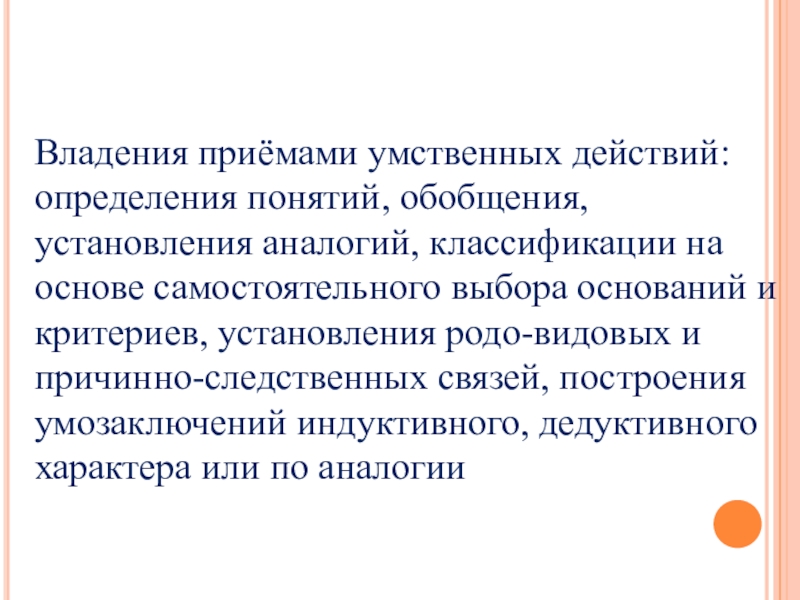 Слайд 44Владения приёмами умственных действий: определения понятий, обобщения, установления аналогий, классификации на