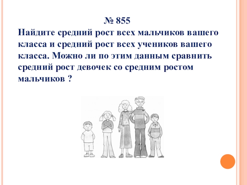 Найдите средний рост всех мальчиков вашего класса и средний рост всех учеников вашего класса. Можно ли по этим данным сравнить средний рост девочек со средним ростом мальчиков ?