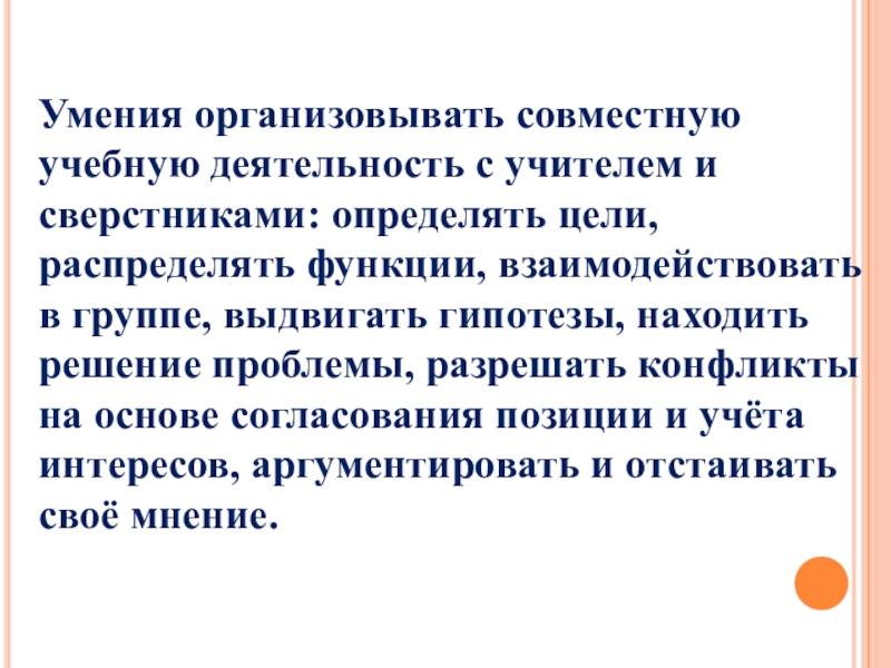 распределять функции, взаимодействовать в группе, выдвигать гипотезы, находить решение проблемы, разрешать конфликты на основе согласования позиции и учёта интересов, аргументировать и отстаивать своё мнение.