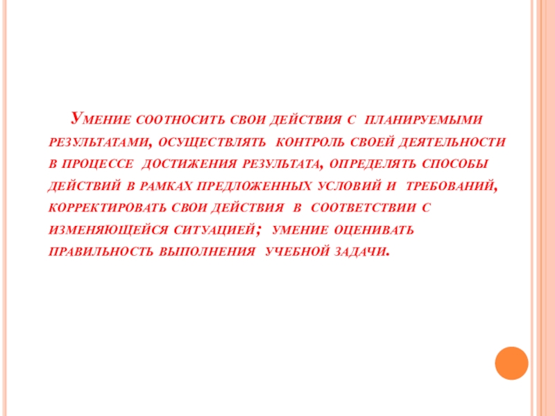 свои действия с планируемыми результатами, осуществлять контроль своей деятельности в процессе достижения результата, определять способы действий в рамках предложенных условий и требований, корректировать свои действия в соответствии с изменяющейся ситуацией; умение оценивать правильность выполнения учебной задачи.