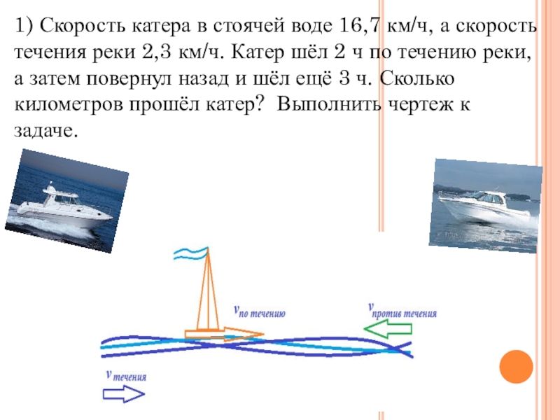Слайд 431) Скорость катера в стоячей воде 16,7 км/ч, а скорость течения