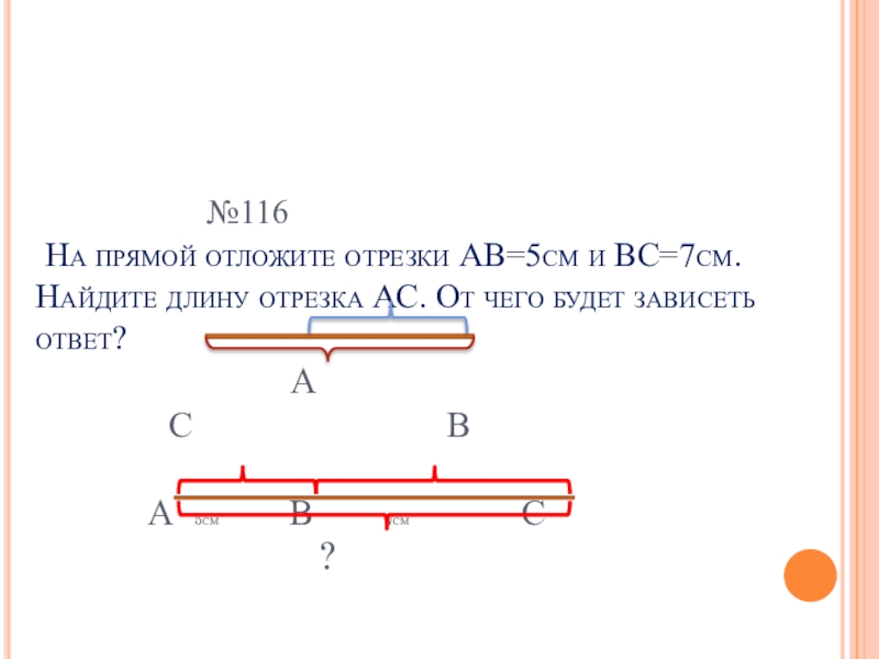 На прямой отложите отрезки АВ=5см и ВС=7см. Найдите длину отрезка АС. От чего будет зависеть ответ?