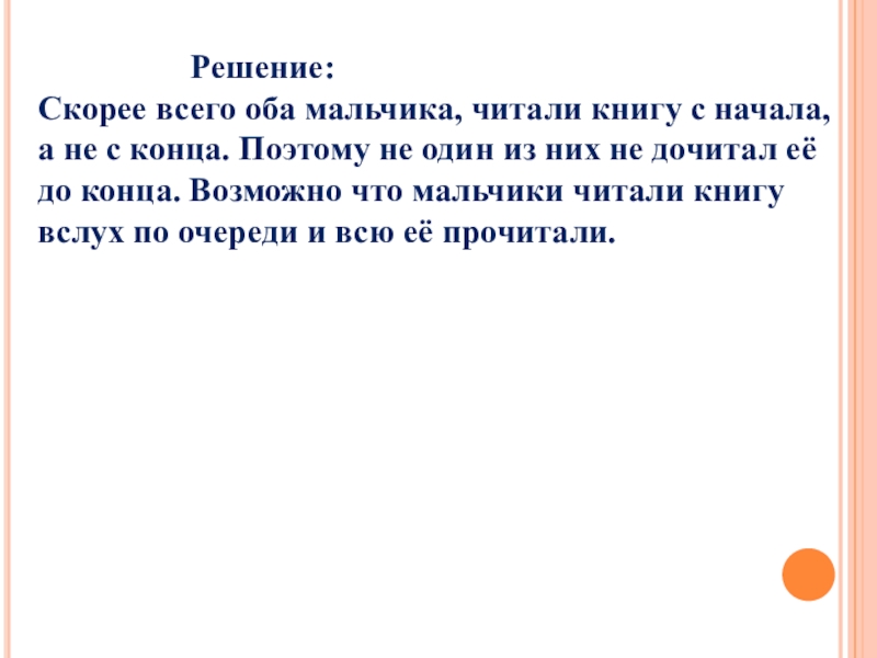 Скорее всего оба мальчика, читали книгу с начала, а не с конца. Поэтому не один из них не дочитал её до конца. Возможно что мальчики читали книгу вслух по очереди и всю её прочитали.